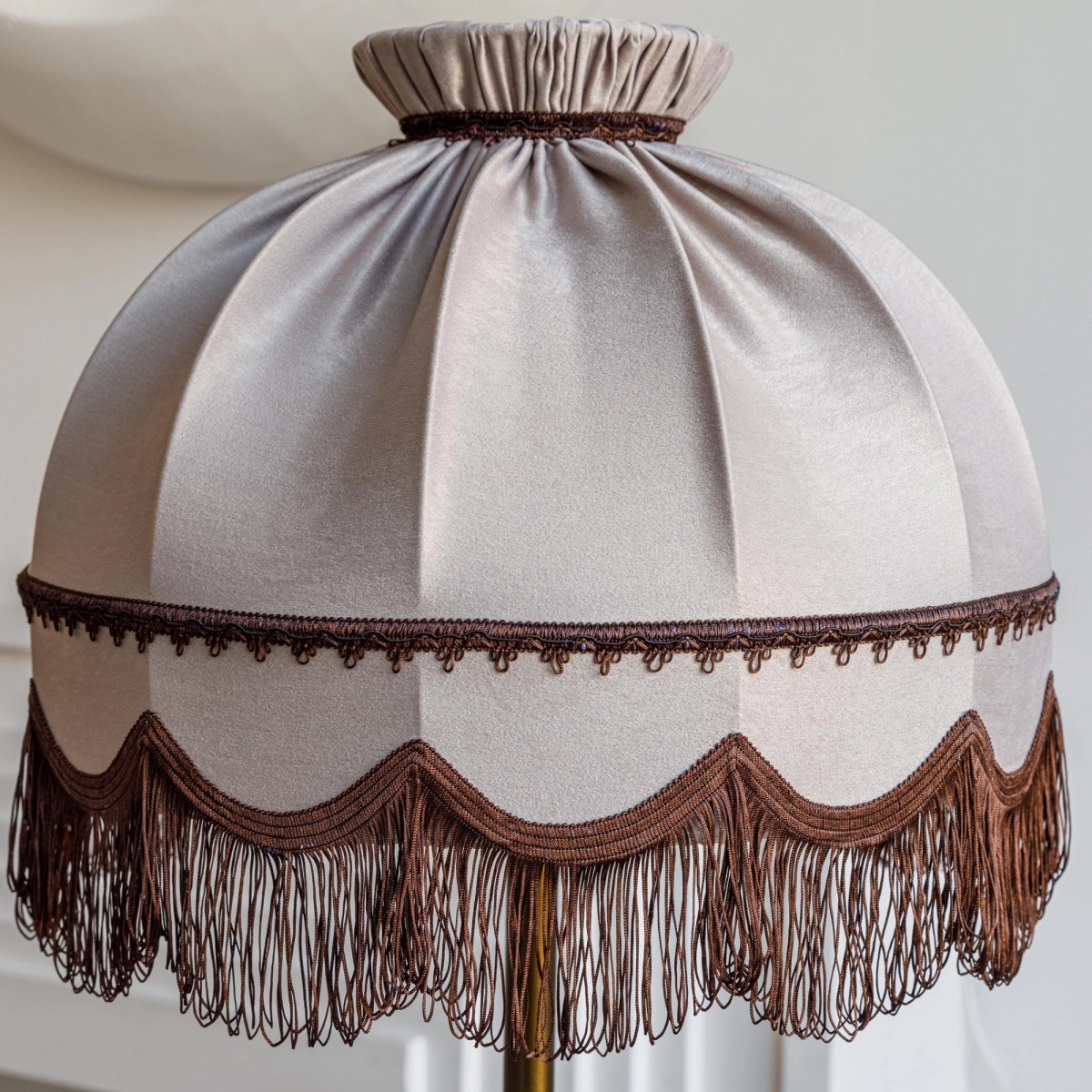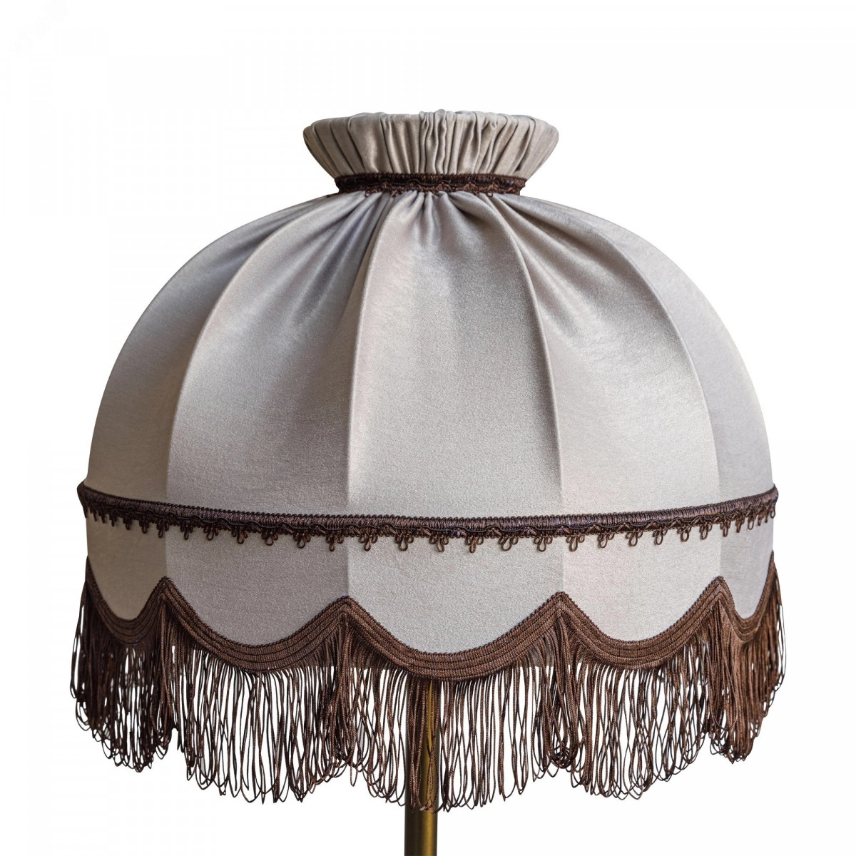 Роскошный АБАЖУР РЕТРО ДЛЯ ТОРШЕРА станет украшением Вашего дома. А его мягкий свет подарит атмосферу уюта и комфорта. ГАБАРИТЫ. Высота абажура – 37 см, верхний диаметр – 18 см, нижний диаметр – 49 см. АБАЖУР ОТШИТ ИЗ ТКАНИ софт. Ворсистая с лицевой стороны и гладкая с изнанки, с деликатным блеском, она хорошо ложится в складки и драпировки, прекрасно подходит для оформления интерьера. ЦВЕТ ткани – капучино, благородный оттенок. Абажур исполнен в стиле ретро и декорирован контрастной бахромой. Абажур смотрится элегантно в дневное время, а в вечернее дарит красивый, мягкий свет, который преображает пространство вокруг, делает его по-домашнему уютным. КАРКАС АБАЖУРА изготовлен из проволоки d-4 мм, что придает стабильность и прочность, но дополнительно не утяжеляет его.
