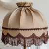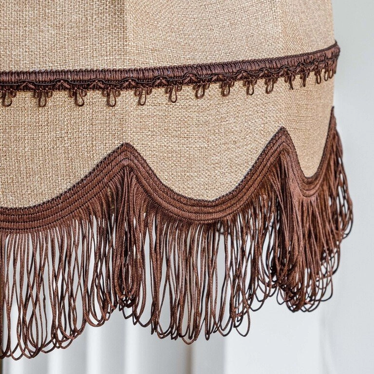 Роскошный абажур ретро для торшера станет украшением Вашего дома. Абажур смотрится элегантно в дневное время, а в вечернее дарит красивый, мягкий свет, который преображает пространство вокруг, делает его по-домашнему уютным. Абажур отшит из льняной ткани с характерной рельефной фактурой. Цвет - капучино, благородный бежево-коричневый оттенок. Абажур исполнен в стиле ретро и декорирован контрастной бахромой. КАРКАС изготовлен из проволоки d-4 мм, что придает стабильность и прочность, но дополнительно не утяжеляет абажур. Абажур предназначен для светильников с патроном Е27.