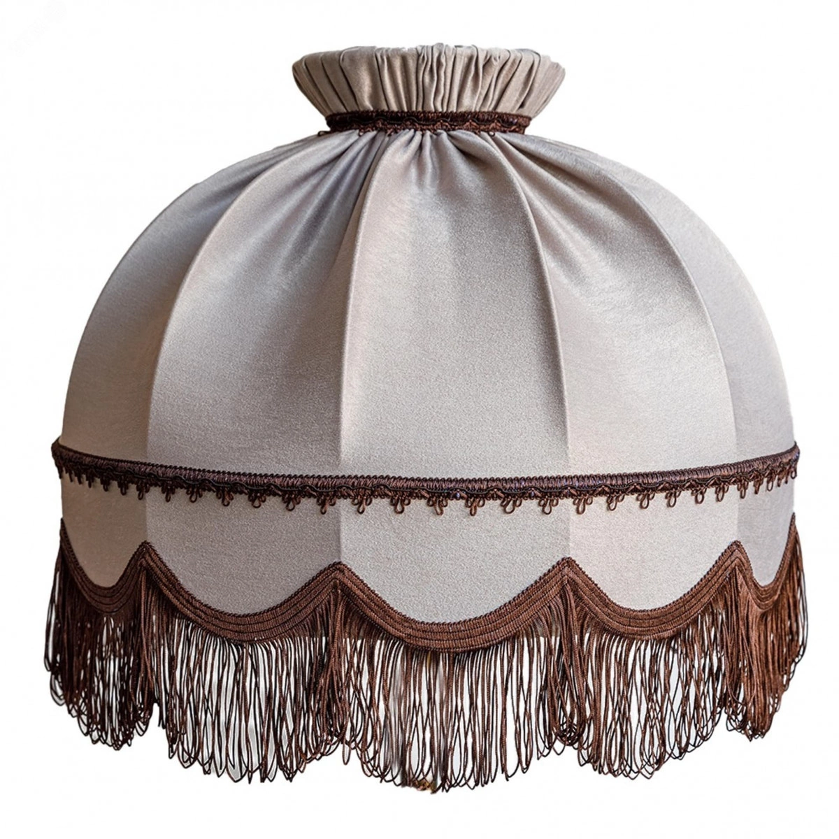 Роскошный АБАЖУР РЕТРО ДЛЯ ПОДВЕСНОГО СВЕТИЛЬНИКА станет украшением Вашего дома. А его мягкий свет подарит атмосферу уюта и комфорта. ГАБАРИТЫ. Высота абажура – 37 см, верхний диаметр – 18 см, нижний диаметр – 49 см. АБАЖУР – из ткани софт. Ворсистая с лицевой стороны и гладкая с изнанки, с деликатным блеском, она хорошо ложится в складки и драпировки, прекрасно подходит для оформления интерьера. ЦВЕТ ткани – капучино, благородный оттенок. Абажур исполнен в стиле ретро и декорирован контрастной бахромой. Абажур смотрится элегантно в дневное время, а в вечернее дарит красивый, мягкий свет, который преображает пространство вокруг, делает его по-домашнему уютным. КАРКАС АБАЖУРА изготовлен из проволоки d-4 мм, что придает стабильность и прочность, но дополнительно не утяжеляет его.