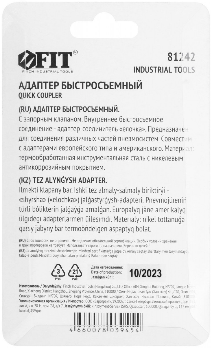 Адаптер быстросъемный FIT IT предназначен для соединения различных частей пневмосистем. Совместим с адаптерами европейского и американского типа. Штуцерное соединение исключает протечку воздуха в местах соединения шлангов. Быстросъемное соединение способствует высокой скорости подключения к различным элементам пневматических систем. Стальной корпус дает возможность работы под высоким давлением. Никелевое покрытие предотвращает коррозию.