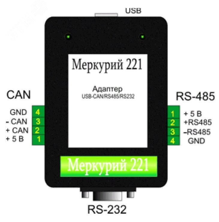 Адаптер Меркурий 221 предназначен для преобразования сигналов интерфейса USB в CAN/RS-485/RS-232 и подключения к персональному компьютеру одного или нескольких электросчетчиков 'Меркурий' со встроенными интерфейсами CAN/RS-485, либо устройств с трехпроводным интерфейсом RS-232.