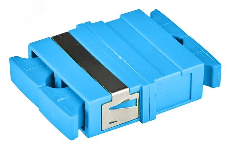 Двойная оптическая розетка (адаптер) предназначена для соединения разъемов (коннекторов) типа SC с прямой (UPC) полировкой одномодового (SM) волокна. Корпус розетки выполнен из пластика синего цвета. Стыковка наконечников оптических соединителей осуществляется при помощи прецизионной центрирующей втулки, изготовленной из циркониевой керамики. Фиксация разъемов осуществляется с помощью скрытых защелок. На присоединительных частях корпуса адаптера имеются выемки под ключ вилок коннекторов. Крепление розетки на адаптерную планку осуществляется с помощью металлического стопора. В данном исполнении корпус розетки не имеет фланцев для дополнительной фиксации розетки с помощью винтов. Адаптеры комплектуются пластиковыми заглушками для защиты от пыли до установки в них коннекторов.