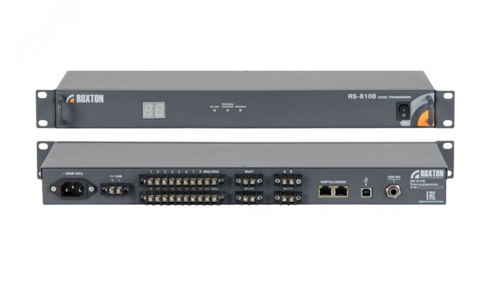 Является комбинированным решением, осуществляющим согласование программного комплекса ROXTON-SOFT с блоками системы оповещения ROXTON 8000, функционирующими под управлением интерфейса RS-485. Блок предназначен для монтажа в электротехническую стойку (19 дюймов) и имеет возможность комбинированного питания (АС-220В, DC-24В).
