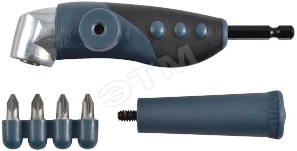 Адаптер для бит. Угол 105 градусов. Для работы с электродрелями и шуруповертами. Переставная ручка. В комплекте 4 биты из CR-V стали PH2, PH2, PZ2, PZ2. Материал - корпус из ударопрочного ABS пластика, пластиковая ручка. Упаковка - блистер.