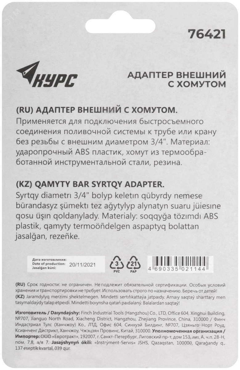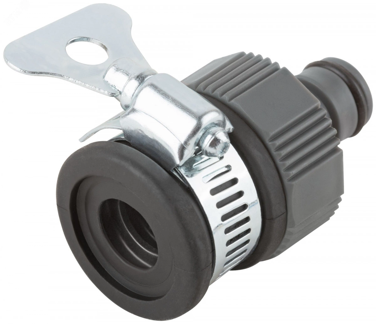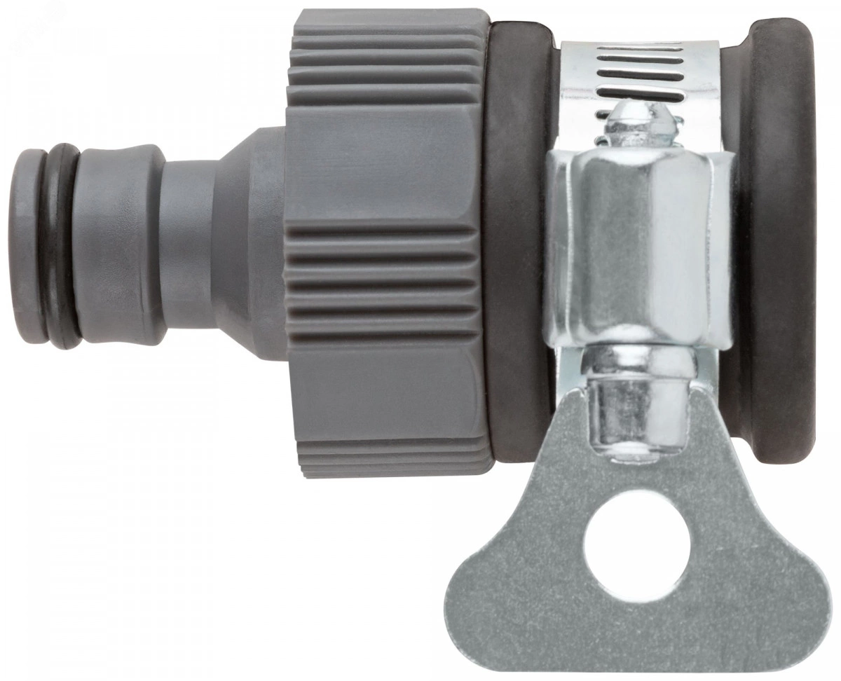 С хомутом. Для соединения поливочных шлангов разных диаметров с водонапорными трубами (в том числе безрезьбовыми), диаметром 3/4 (17-20мм), через универсальное быстросъемное соединение. Материал - резина, пластик, хомут из инструментальной стали. Упаковка - блистер.