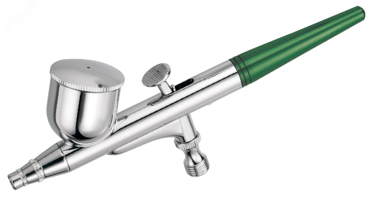 Пневматический аэрограф независимого двойного действия, внутреннего смешивания с неподвижной емкостью и фиксированным распылом. Применяется для нанесения ЛКМ на поверхности, расположенные в плоскостях от горизонтальной до вертикальной.