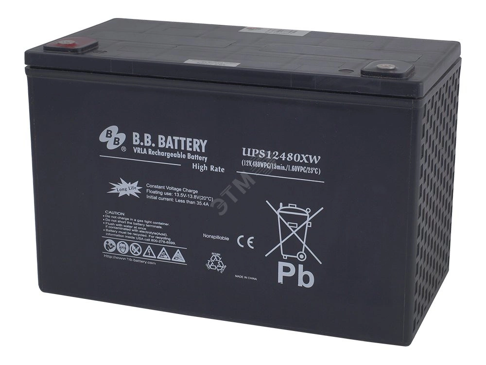 Аккумулятор BB Battery UPS 12480XW работает в буферном и циклическом режимах, его можно устанавливать в любом положении, кроме монтажа на крышку. Ёмкость батареи 120 Ач, напряжение 12 В. B.B. Battery UPS 12480XW обладает низким процентом саморазряда (менее 3 процентов за месяц) и довольно продолжительным сроком службы - 12 лет при соблюдении правил эксплуатации. BB Battery UPS 12480XW использует технологию удержания электролита стекловолоконными сепараторами (AGM), а в корпус встроен пламегаситель.