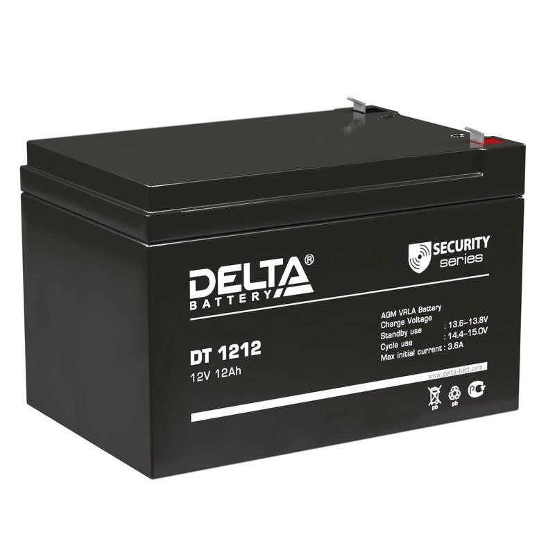 Аккумуляторная батарея Delta DT 1212. Напряжение 12В, емкость 12Ач. Имеет низкое внутреннее сопротивление и высокую плотность энергии. Предназначена для охранно-пожарных систем и СКУД. Срок службы 5 лет.