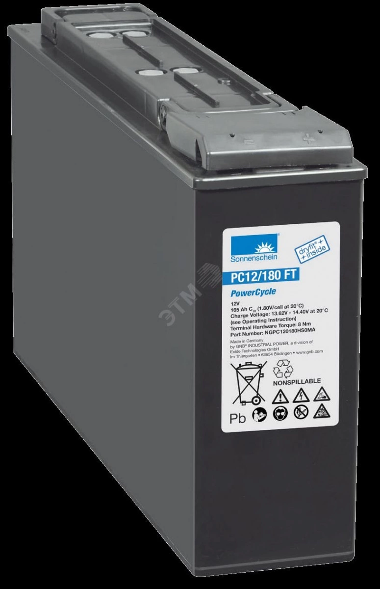 Стационарный аккумулятор Sonnenschein PC 12/180.0 FT (серийный номер NGA4120180HS0CA) напряжением 12В емкостью 180Ач изготовлен по фирменной технологии dryfit с желеобразным электролитом и является необслуживаемым. Аккумулятор производства концерна GNB Industrial Power (до 2010 г Exide Technologies, Германия). Срок полезной работы аккумулятора достигает 15 лет. Аккумулятор полностью герметичен и изготовлен из намазных пластин со свинцово-кальциевым легированием. А412/180A успешно используется в России и мире ведущими операторами сетей сотовой связи. Может работать как в буферном так и циклическом режимах.