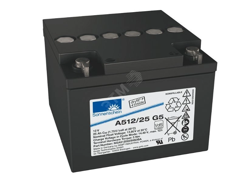 Свинцово-кислотный аккумулятор Sonnenschein A512/25 G5 (ёмкость 25 Ач, напряжение 12 В) предназначен для эксплуатации в буферном и циклическом режимах. Использование технологии Dryfit даёт целый ряд преимуществ - повышенный срок службы (до 12 лет), снижена возможность протекания электролита (он загущен до желеобразного состояния), не требуется доливать воду (рекомбинация газов происходит внутри корпуса), устойчивость к внутренним коротким замыканиям и глубоким разрядам, работа в широком диапазоне температур. Корпус выполнен из неокисляемого долговечного пластика и полностью герметичен.