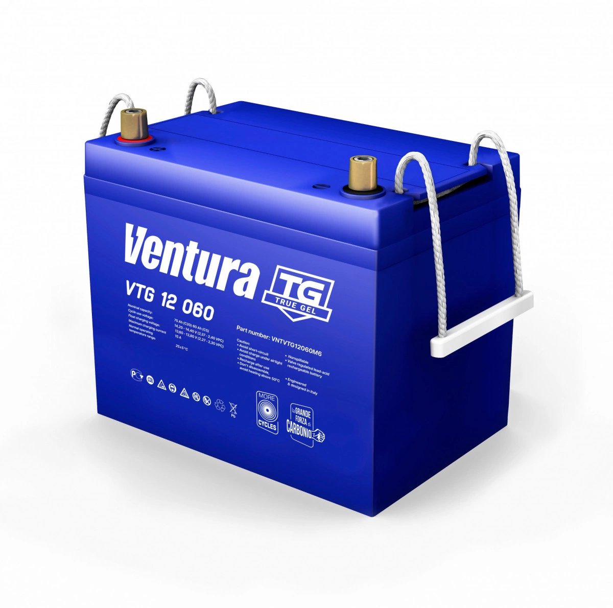 Свинцово-кислотный тяговый аккумулятор VENTURA VTG 12-060 (ёмкость 59 Ач (C5), напряжение 12 вольт) разработан с применением технологии GEL. Она обеспечивает больший срок службы (до 800 циклов при DOD 60%), быструю подзарядку и повышенную температурную устойчивость. Корпус выполнен из прочного ABS пластика и усилен рёбрами жёсткости. Конструкция полностью герметична и не требует обслуживания, это достигается благодаря наличию одностороннего клапана избыточного давления (VRLA). Тяговый аккумулятор VENTURA VTG 12-060 подходит для электромоторов лодок, катеров, погрузочно-разгрузочной, полоуборочной и другой электротяговой техники. Дата производства аккумулятора VENTURA VTG 12-060 указана на крышке в виде символьного кода.