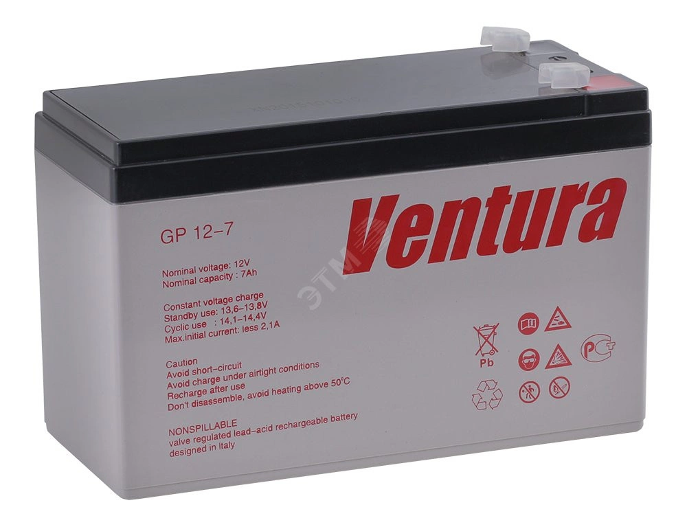 Аккумулятор Ventura GP 12-7.0 обладает низким внутренним сопротивлением, он может использоваться в буферном и циклическом режимах. Благодаря своим характеристикам (7 Ач, 12 В) и продолжительному сроку службы (6 лет) он применяется в ИБП, нефтегазовой отрасли, охранно-охранных системах и телекоммуникациях. Корпус представляет из себя герметичный моноблок, выполненный из ABS-пластика, на крышке которого располагается односторонний клапан избыточного давления, это позволяет использовать Ventura GP 12-7 в горизонтальном и вертикальном положении (установка на крышку не допускается). Сепараторы из стекловолокна (AGM) удерживают жидкий электролит неподвижно.