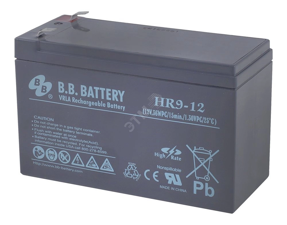 Аккумуляторные батареи BB BATTERY HR9-12 используют технологию AGM (электролит абсорбирован в стекловолоконный сепаратор). Данная модель имеет напряжение 12 В и емкость 9 Ач. Герметичный корпус из неокисляемого ABS-пластика позволяет монтировать аккумулятор в любом положении, кроме установки на крышку. Срок службы B B BATTERY HR9-12 составляет 10 лет, он практически не требует обслуживания (в том числе долива воды) и работает как в циклическом режиме, так и в режиме постоянного подзаряда.