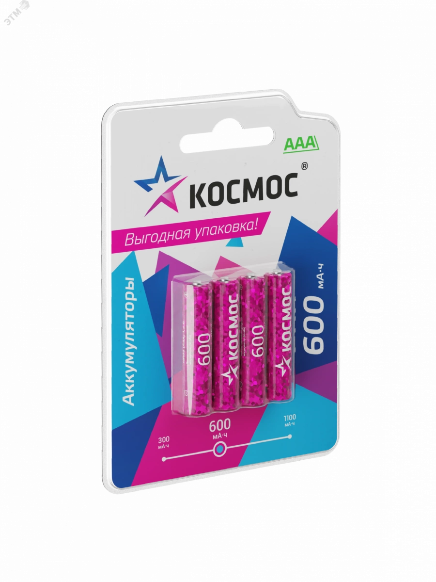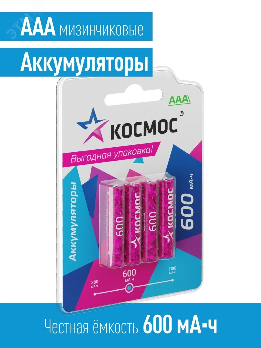 Ni-Mh (никель-металлогидридные) аккумуляторы Космос – заменяют обычные батарейки типоразмера ААА (также называют «мизинчиковые», на приборах-потребителях может обозначаться как LR03, R03, UM4). Быстро окупятся - можно заряжать сотни раз, экономя на обычных батарейках. В упаковке 4 шт. – достаточно для двух разных приборов. Емкость 600 мАч – для устройств средней мощности - например компьютерной мышки. Важно – перед первым использованием аккумуляторы нужно зарядить.