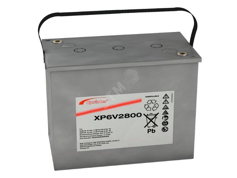 Аккумуляторная батарея SPRINTER XP - (Station), XP6V2800 (NAXP062800HP0FA) , напряжение 6 В, емкость 195 Ач. Выпускаются в диапазоне мощностей от 1840 до 3400 Вт/блок. Изготовлены по технологии AGM (жидкий электролит, впитанный в стекловолоконный сепаратор). Способны обеспечивать особо высокие разрядные характеристики (+20 процентов) и длительный срок службы. Области применения - источники бесперебойного питания (UPS) и системы безопасности. Срок службы 10 лет в режиме постоянного подзаряда и температуре 20 градусов С (остаточная емкость 80 процентов).