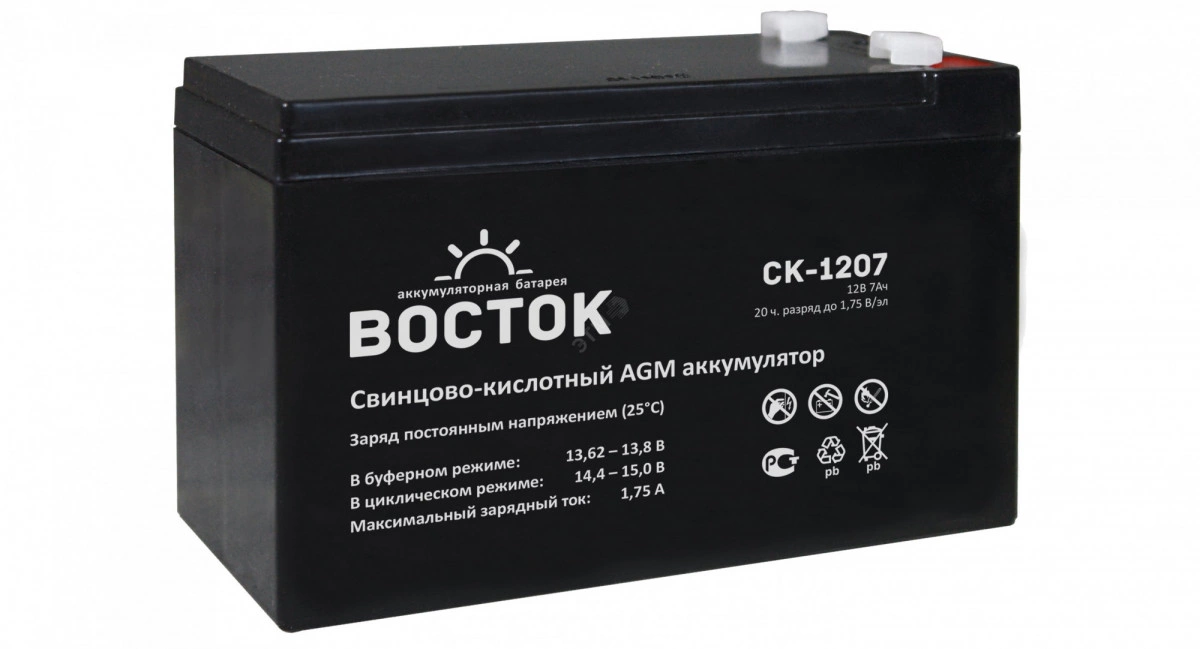 Свинцово-кислотный аккумулятор Восток СК-1212 (емкость 12 Ач, напряжение 12 В) обладает высокими разрядными и эксплуатационными характеристиками. Высокое качество батарей позволяет использовать их в ИБП, системах отопления/водоснабжения, резервных системах энергоснабжения. Полностью герметичный корпус из ABS-пластика позволяет газам рекомбинировать внутри аккумулятора, это делает Восток СК1212 необслуживаемым — доливать воду не требуется. Срок службы батареи в циклическом режиме при правильной эксплуатации достигает 1200 циклов, в буферном — 5 лет.