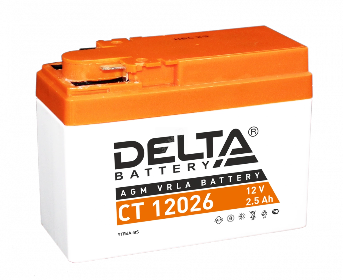 Герметизированный необслуживаемый VRLA cвинцово-кислотный стартовый аккумулятор Delta CT 12026 напряжением 12В и емкостью 2.5Ач. Обладает стартовым током в 45А. Полярность - боковая (- +). Аккумулятор соответствует следующему коду YUASA - YTR4A-BS. Разработан специально для пуска двигателей мототехники. Изготовлен по технологии AGM (с микропористым заполнителем, пропитанным электролитом) из негорючего ABS пластика. Срок службы аккумулятора достигает 3-5 лет. Высокая стартовая мощность и повышенная энергоотдача. Адаптирован к Российским условиям эксплуатации.