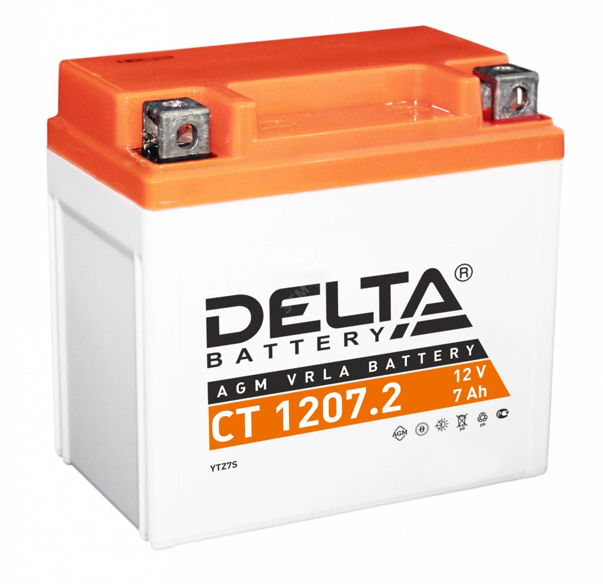 Герметизированный необслуживаемый VRLA cвинцово-кислотный стартовый аккумулятор Delta CT 1207.2 напряжением 12В и емкостью 7Ач. Обладает стартовым током в 130А. Полярность - обратная (- +). Аккумулятор соответствует следующему коду YUASA - YTZ7S. Разработан специально для пуска двигателей мототехники. Изготовлен по технологии AGM (с микропористым заполнителем, пропитанным электролитом) из негорючего ABS пластика. Срок службы аккумулятора достигает 3-5 лет. Высокая стартовая мощность и повышенная энергоотдача. Адаптирован к Российским условиям эксплуатации.