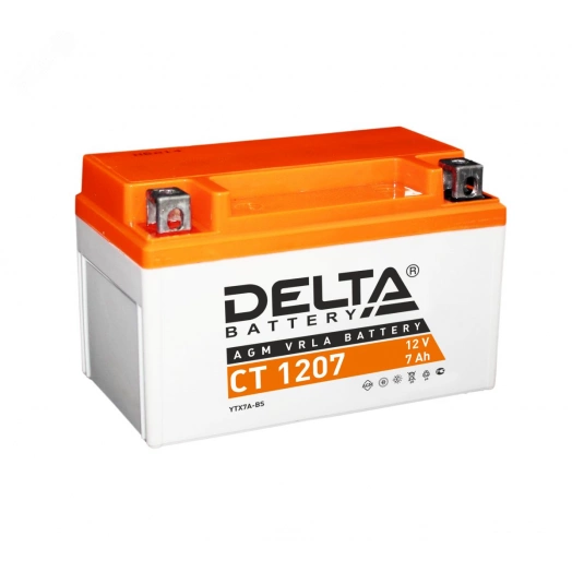 Герметизированный необслуживаемый VRLA cвинцово-кислотный стартовый аккумулятор Delta CT 1207 напряжением 12В и емкостью 7Ач. Обладает стартовым током в 105А. Полярность - прямая (+ -). Аккумулятор соответствует следующему коду YUASA - YT4B-BS . Разработан специально для пуска двигателей мототехники. Изготовлен по технологии AGM (с микропористым заполнителем, пропитанным электролитом) из негорючего ABS пластика. Срок службы аккумулятора достигает 3-5 лет. Высокая стартовая мощность и повышенная энергоотдача. Адаптирован к Российским условиям эксплуатации.