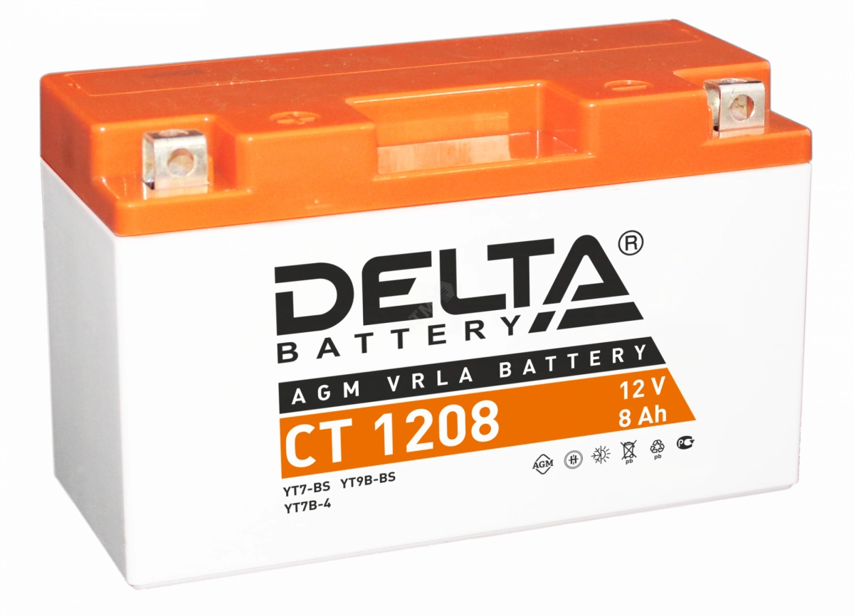 Герметизированный необслуживаемый VRLA cвинцово-кислотный стартовый аккумулятор Delta CT 1208 напряжением 12В и емкостью 8Ач. Обладает стартовым током в 110А. Полярность - прямая (+ -). Аккумулятор соответствует следующему коду YUASA - YT7B-BS, YT7B-4, YT9B-BS . Разработан специально для пуска двигателей мототехники. Изготовлен по технологии AGM (с микропористым заполнителем, пропитанным электролитом) из негорючего ABS пластика. Срок службы аккумулятора достигает 3-5 лет. Высокая стартовая мощность и повышенная энергоотдача. Адаптирован к Российским условиям эксплуатации.