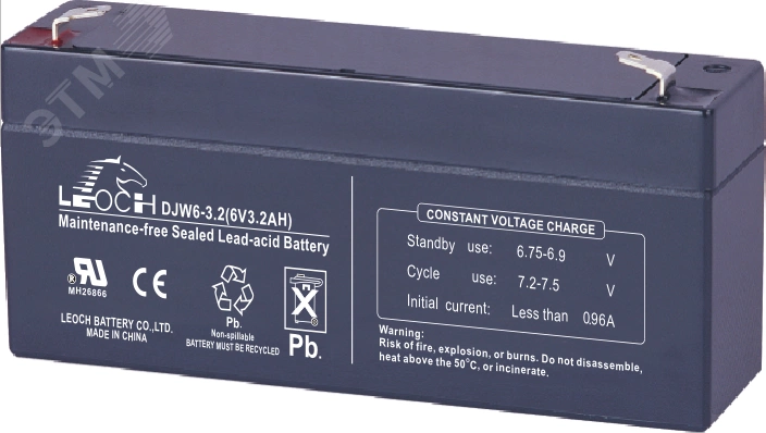 Свинцово-кислотный аккумулятор Leoch DJW6-3.2 предназначен для работы как в буферном (до 8 лет при правильном использовании), так и в циклическом (260 циклов при 100% глубине разряда). Он обладает ёмкостью 3.2 Ач, напряжением 6 В и применяется в ИБП, охранных и пожарных системах, телекоммуникациях. Жидкий электролит удерживается неподвижно внутри герметичного корпуса стекловолоконными сепараторами (absorbed glass mat), что полностью исключает возможность протечки. На крышке Leoch DJW 6-3.2 располагается односторонний клапан, который позволяет газам внутри корпуса рекомбинировать и сбрасывает избыточное давление.