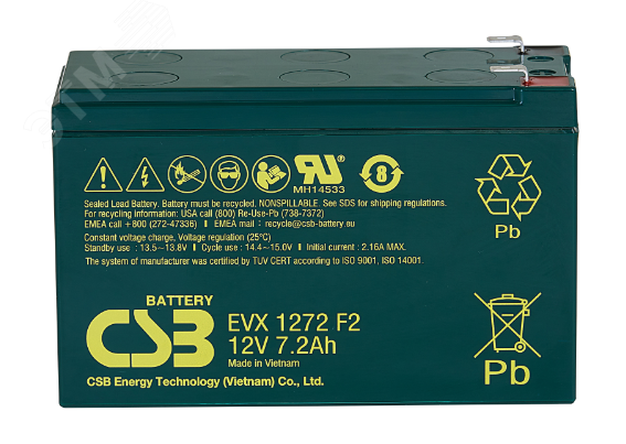 Аккумулятор CBS EVX 1272 (12 В, 7.2 Ач) создан с использованием технологии AGM и обладает внушительным сроком службы в циклическом режиме до 400 циклов разряда-заряда при 100% разрядке, 1800 циклов при 30% и 8 лет при работе в буферном режиме. Корпус из ABS-пластика полностью герметичен, что предотвращает испарение электролита (не требуется доливать воду) и позволяет устанавливать CBS EVX 1272 в любом положении. Аккумуляторная батарея CSB EVX 1272 имеет усовершенствованную конструкцию легированных кальцием электродов из особо чистого свинца, что обеспечивает продолжительный срок службы и улучшенные разрядные характеристики. Аккумулятор отвечает всем современным требованиям к герметизированным батареям, имеет сертификат соответствия Госстандарта РФ (''Ростест''), заключение ВНИИПО МВД ''О пожаровзрывобезопасности''.