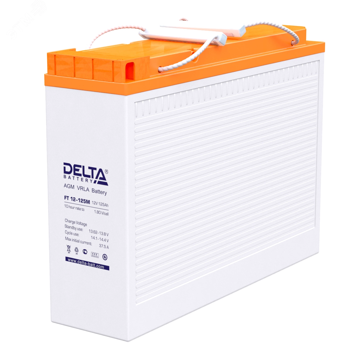 Герметизированный VRLA cвинцово-кислотный аккумулятор Delta FT 12-125 M напряжением 12В и емкостью 125Ач изготовлен по технологии AGM (с микропористым заполнителем, пропитанным электролитом). Конструкция оптимизирована для установки в 19'' и 23'' шкафы и стойки. Изготовлен из негорючего ABS пластика. Срок службы аккумулятора достигает 10-12 лет. Аккумулятор предназначен для работы в режиме постоянного подзаряда (буферный режим) или в режиме разряд-заряд (циклический режим). Обладает низким внутренним сопротивлением и саморазрядом.