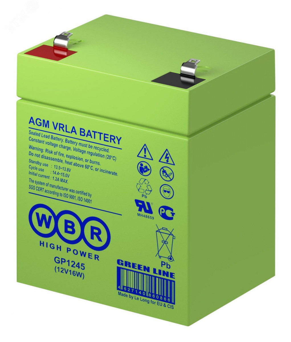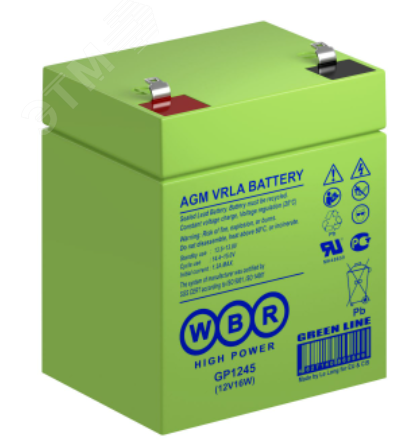 Аккумуляторная батарея WBR GP 1245 16W - герметизированные, выполненные по технологии AGM, батареи общего применения со сроком службы до 8 лет в буферном режиме или 260 циклов заряда-разряда в циклическом режиме при 100% разряде. Эти высокоэффективные перезаряжаемые батареи не требуют обслуживания в течение всего срока службы.