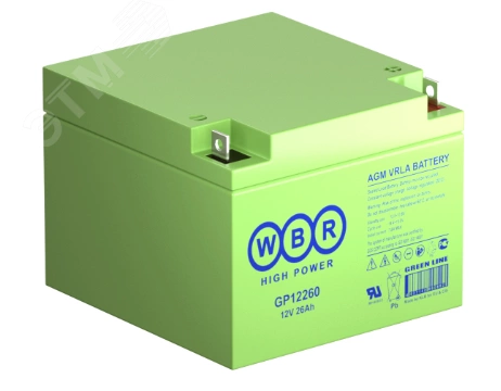 Аккумуляторная батарея WBR GP 12260 - герметизированные, выполненные по технологии AGM, свинцово-кислотные аккумуляторные батареи общего применения со сроком службы до 8 лет в буферном режиме или 260 циклов заряда-разряда в циклическом режиме при 100% разряде. Эти высокоэффективные перезаряжаемые батареи не требуют обслуживания в течение всего срока службы.