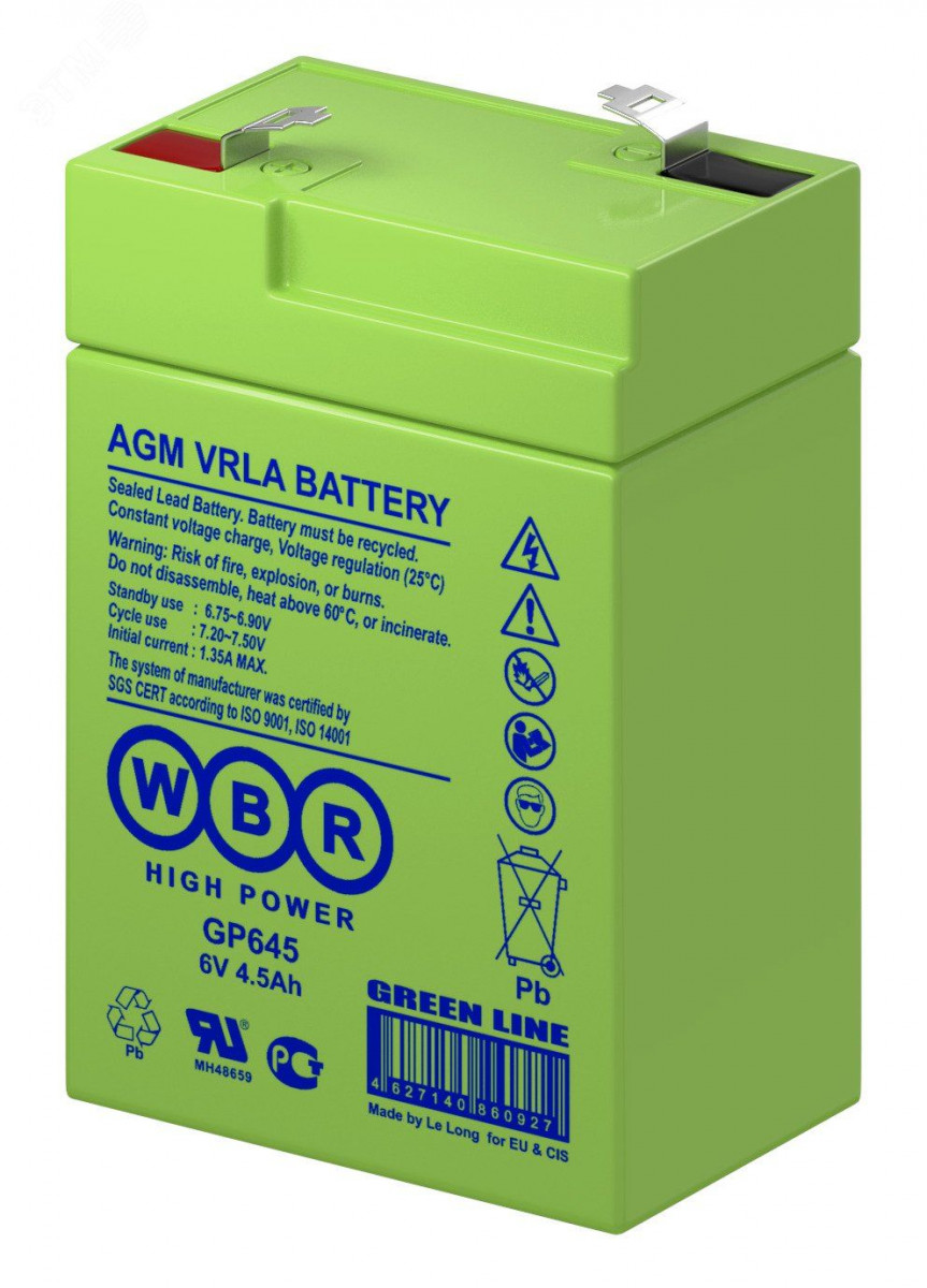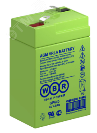 Аккумуляторная батарея WBR GP 645 - герметизированные, выполненные по технологии AGM, батареи общего применения со сроком службы до 8 лет в буферном режиме или 260 циклов заряда-разряда в циклическом режиме при 100% разряде. Эти высокоэффективные перезаряжаемые батареи не требуют обслуживания в течение всего срока службы.