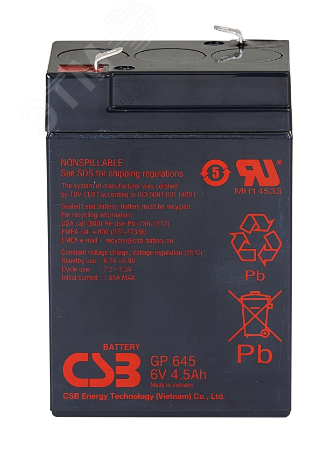 CSB GP 645 (6 В, 4.5 Ач) является одним из самых распространенных свинцово-кислотных аккумуляторов общего назначения. Корпус батареи выполнен из долговечного ABS-пластика и имеет предохранительный клапан для сброса избыточного давления. Аккумулятор полностью герметичен (не требует долива воды), а значит может работать в любом положении. GP 645 выполнен по технологии AGM (стекловолоконный сепаратор, пропитанный жидким электролитом). Срок службы достигает 5 лет или около 260 циклов при 100% разряде. Аккумуляторная батарея CSB GP 645 имеет усовершенствованную конструкцию легированных кальцием электродов из особо чистого свинца, что обеспечивает продолжительный срок службы и улучшенные разрядные характеристики. Аккумулятор отвечает всем современным требованиям к герметизированным батареям, имеет сертификат соответствия Госстандарта РФ (''Ростест''), заключение ВНИИПО МВД ''О пожаровзрывобезопасности''.