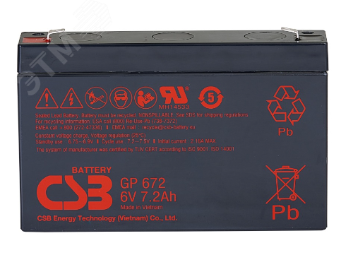CSB GP 672 (6 В, 7.2 Ач) является одним из самых распространенных свинцово-кислотных аккумуляторов общего назначения. Корпус батареи выполнен из долговечного ABS-пластика и имеет предохранительный клапан для сброса избыточного давления. Аккумулятор полностью герметичен (не требует долива воды), а значит может работать в любом положении. CSB GP 672 выполнен по технологии AGM (стекловолоконный сепаратор, пропитанный жидким электролитом). Срок службы достигает 5 лет или около 260 циклов при 100% разряде. Аккумуляторная батарея CSB GP 672 имеет усовершенствованную конструкцию легированных кальцием электродов из особо чистого свинца, что обеспечивает продолжительный срок службы и улучшенные разрядные характеристики. Аккумулятор отвечает всем современным требованиям к герметизированным батареям, имеет сертификат соответствия Госстандарта РФ (''Ростест''), заключение ВНИИПО МВД ''О пожаровзрывобезопасности''.