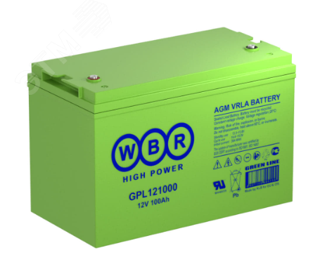 Аккумуляторная батарея WBR серии GPL 121000 - герметизированные, выполненные по технологии AGM, свинцово-кислотные аккумуляторные батареи общего применения с увеличенным 12 летним сроком службы в буферном режиме или 260 циклов заряда-разряда в циклическом режиме при 100% разряде. Эти высокоэффективные перезаряжаемые батареи не требуют обслуживания в течение всего срока службы.
