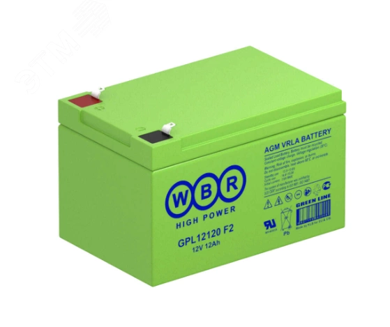 Аккумуляторная батарея WBR серии GPL 12120 - герметизированные, выполненные по технологии AGM, свинцово-кислотные аккумуляторные батареи общего применения с увеличенным 12 летним сроком службы в буферном режиме или 260 циклов заряда-разряда в циклическом режиме при 100% разряде. Эти высокоэффективные перезаряжаемые батареи не требуют обслуживания в течение всего срока службы.