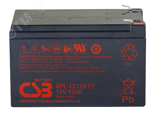 Аккумулятор CSB GPL 12120 с напряжением 12 В и емкостью 12 Ач обладает увеличенным сроком службы — до 12 лет. Технология AGM и надежный корпус из ABS-пластика обеспечивают полную герметичность, а значит батарею можно использовать в любом положении и не надо обслуживать. CSB GPL 12120 предназначен для работы как в циклическом, так и в буферном режиме, его применение очень широко. Аккумуляторная батарея CSB GPL 12120 имеет усовершенствованную конструкцию легированных кальцием электродов из особо чистого свинца, что обеспечивает продолжительный срок службы и улучшенные разрядные характеристики. Аккумулятор отвечает всем современным требованиям к герметизированным батареям, имеет сертификат соответствия Госстандарта РФ (''Ростест''), заключение ВНИИПО МВД ''О пожаровзрывобезопасности''.