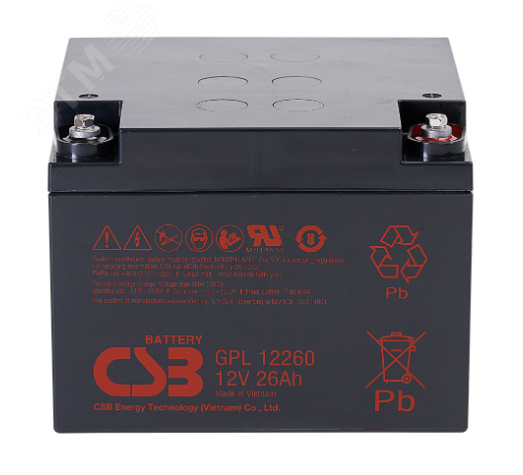 Аккумулятор CSB GPL 12260 с напряжением 12 В и емкостью 26 Ач обладает увеличенным сроком службы — до 12 лет. Технология AGM и надежный корпус из ABS-пластика обеспечивают полную герметичность, а значит батарею можно использовать в любом положении и не надо обслуживать. CSB GPL 12260 предназначен для работы как в циклическом, так и в буферном режиме, его применение очень широко. Аккумуляторная батарея CSB GPL 12260 имеет усовершенствованную конструкцию легированных кальцием электродов из особо чистого свинца, что обеспечивает продолжительный срок службы и улучшенные разрядные характеристики. Аккумулятор отвечает всем современным требованиям к герметизированным батареям, имеет сертификат соответствия Госстандарта РФ (''Ростест''), заключение ВНИИПО МВД ''О пожаровзрывобезопасности''.