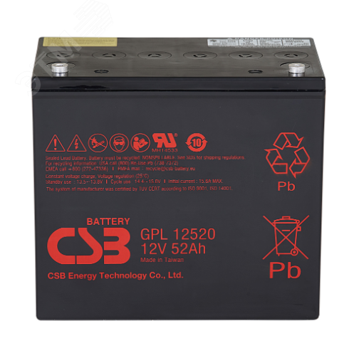 Аккумулятор CSB GPL 12520 с напряжением 12 В и емкостью 52 Ач обладает увеличенным сроком службы — до 12 лет. Технология AGM и надежный корпус из ABS-пластика обеспечивают полную герметичность, а значит батарею можно использовать в любом положении и не надо обслуживать. CSB GPL 12520 предназначен для работы как в циклическом, так и в буферном режиме, его применение очень широко. Аккумуляторная батарея CSB GPL 12520 имеет усовершенствованную конструкцию легированных кальцием электродов из особо чистого свинца, что обеспечивает продолжительный срок службы и улучшенные разрядные характеристики. Аккумулятор отвечает всем современным требованиям к герметизированным батареям, имеет сертификат соответствия Госстандарта РФ (''Ростест''), заключение ВНИИПО МВД ''О пожаровзрывобезопасности''.