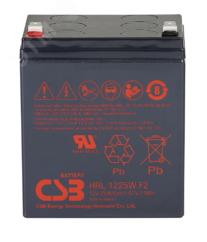 Аккумулятор CSB HRL 1225W емкостью 25 Ач и напряжением 12 В разработан специально для кратковременных разрядов высоким током. Главная особенность батареи — внушительный срок службы, при правильной эксплуатации он может достигать 10 лет. Герметичный корпус из ABS-пластика позволяет использовать CSB HRL 1225W в любом положении, за исключением положения «дном верх» для обеспечения работы предохранительного клапана. Аккумулятор подходит для работы в циклическом и в буферном режиме. Аккумуляторная батарея CSB HRL 1225W имеет усовершенствованную конструкцию легированных кальцием электродов из особо чистого свинца, что обеспечивает продолжительный срок службы и улучшенные разрядные характеристики. Аккумулятор отвечает всем современным требованиям к герметизированным батареям, имеет сертификат соответствия Госстандарта РФ (''Ростест''), заключение ВНИИПО МВД ''О пожаровзрывобезопасности''.