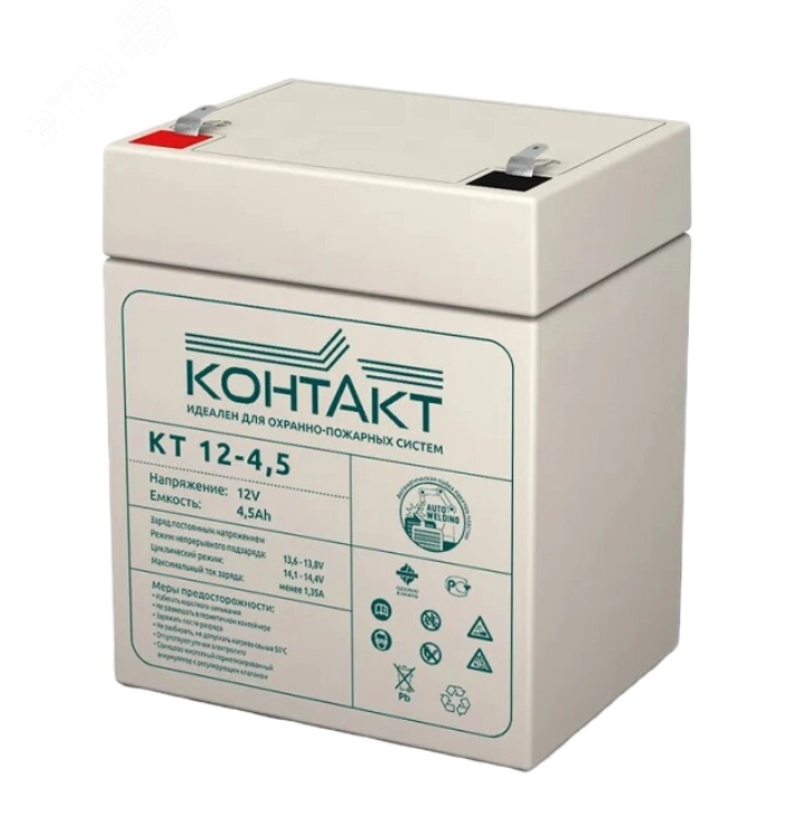 Бюджетная свинцово-кислотная герметизированная аккумуляторная батарея Контакт КТ 12-4.5 , с напряжением 12 В, емкостью 4.5 Ач. Технология изготовления AGM с абсорбированным электролитом в стекловолоконном сепараторе, идеальны для использования в охранно-противопожарных, а также мелком слаботочном оборудовании (фонари, ККМ, весы). Необслуживаемая VRLA батарея производителя Контакт оптимальна для использования как в циклическом, так и в буферном режиме, но буферный режим эксплуатации более предпочтителен. Расчетный срок службы 3-5 лет.