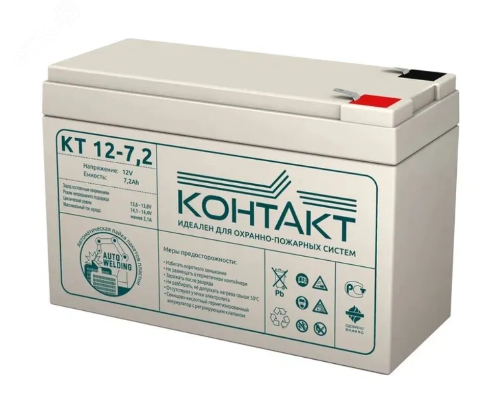 Батарея аккумуляторная (12 В, 7.2 Ач) КОНТАКТ КТ 12-7,2 применяется для охранно-пожарных систем, систем видеонаблюдения, систем контроля и управления доступом, световых и звуковых систем оповещения, электронных кассовых аппаратов. Изготовлена по технологии AGM, герметизирована при помощи клапана избыточного давления. Это надежный, необслуживаемый в течение всего срока эксплуатации автономный источник тока, предназначенный для работы в режиме непрерывного подзаряда. Характеризуется высокой плотностью энергии, низкой скоростью саморазряда и высокой степенью рекомбинации (более 99 %). Система связывания электролита обеспечивает возможность работы АКБ в горизонтальном и вертикальном положении без потери емкости, вытекания электролита или сокращения срока службы. Срок службы 3-5 лет.