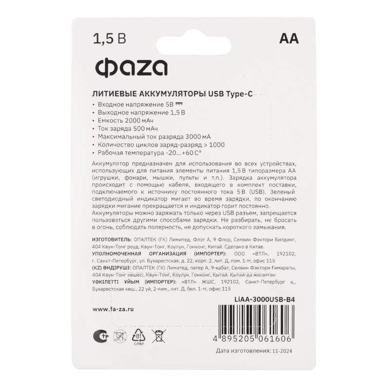 Полное описание: Аккумулятор литиевый AA 1.5В Li-Ion 3000мВт.ч 2000мА.ч зарядка от Type-C шнур в комплекте BL-4 (уп.4шт) ФАZА 5061606