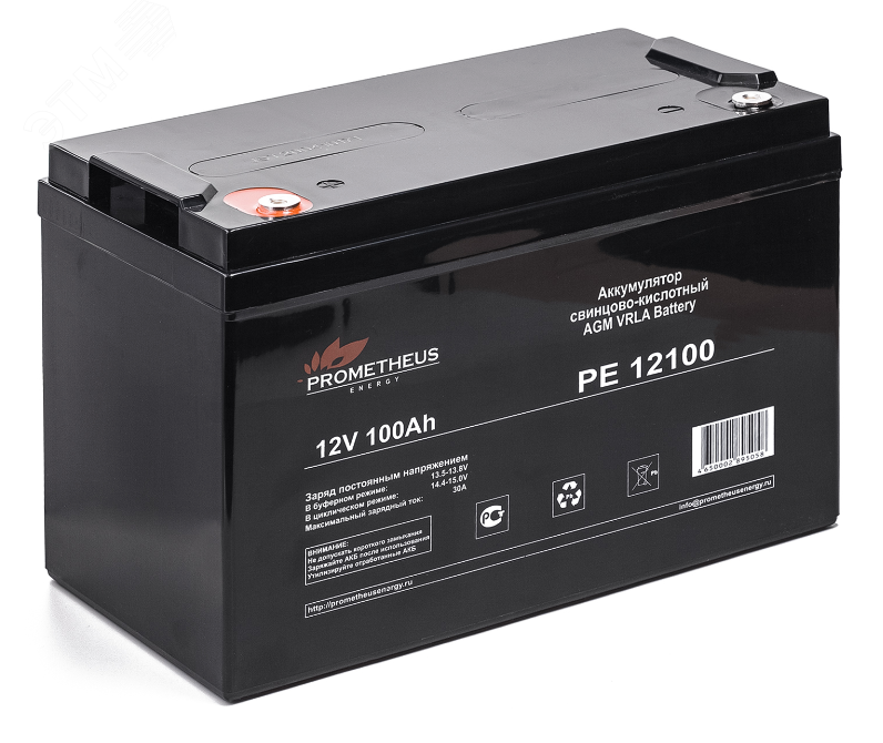 Prometheus Energy свинцово-кислотный аккумулятор PE 12100 создан по технологии AGM, с абсорбированным электролитом. Предлагаемый аккумулятор является не обслуживаемым. Он герметизирован, а образующийся газ рекомбинируется. Долив жидкости не требуется. Корпус аккумулятора изготовлен из негорючего ABS пластика. Емкость аккумуляторной батареи для ИБП составляет 100 Ah, а рабочее напряжение 12 V. Устройство обладает низким саморазрядом (до 3%). Срок службы достигает 6 лет.