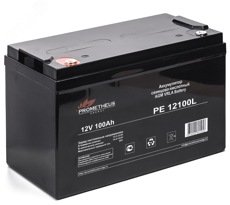 Prometheus Energy свинцово-кислотный аккумулятор PE 12100L создан по технологии AGM, с абсорбированным электролитом и увеличенным сроком службы. Предлагаемый аккумулятор является необслуживаемым. Он герметизирован, а образующийся газ рекомбинируется. Долив жидкости не требуется. Корпус аккумулятора изготовлен из негорючего ABS пластика. Емкость аккумуляторной батареи для ИБП составляет 100 Ah, а рабочее напряжение 12 V. Устройство обладает низким саморазрядом (<2%). Срок службы достигает 10 лет.