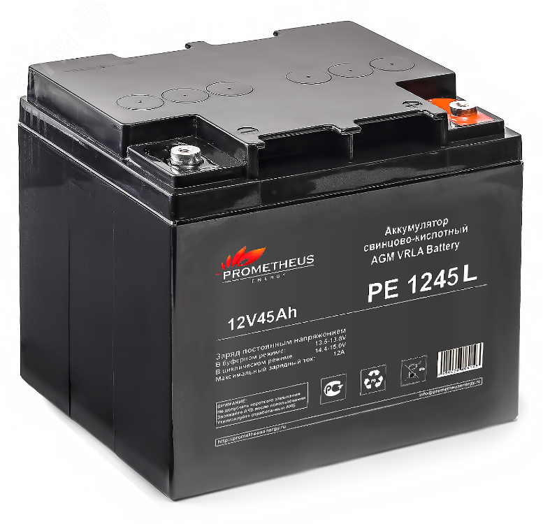 Prometheus Energy свинцово-кислотный аккумулятор PE 1245L создан по технологии AGM, с абсорбированным электролитом. Предлагаемый аккумулятор является не обслуживаемым. Он герметизирован, а образующийся газ рекомбинируется. Долив жидкости не требуется. Корпус аккумулятора изготовлен из негорючего ABS пластика. Емкость аккумуляторной батареи для ИБП составляет 45 Ah, а рабочее напряжение 12 V. Устройство обладает низким саморазрядом (до 3%). Срок службы достигает 10 лет.
