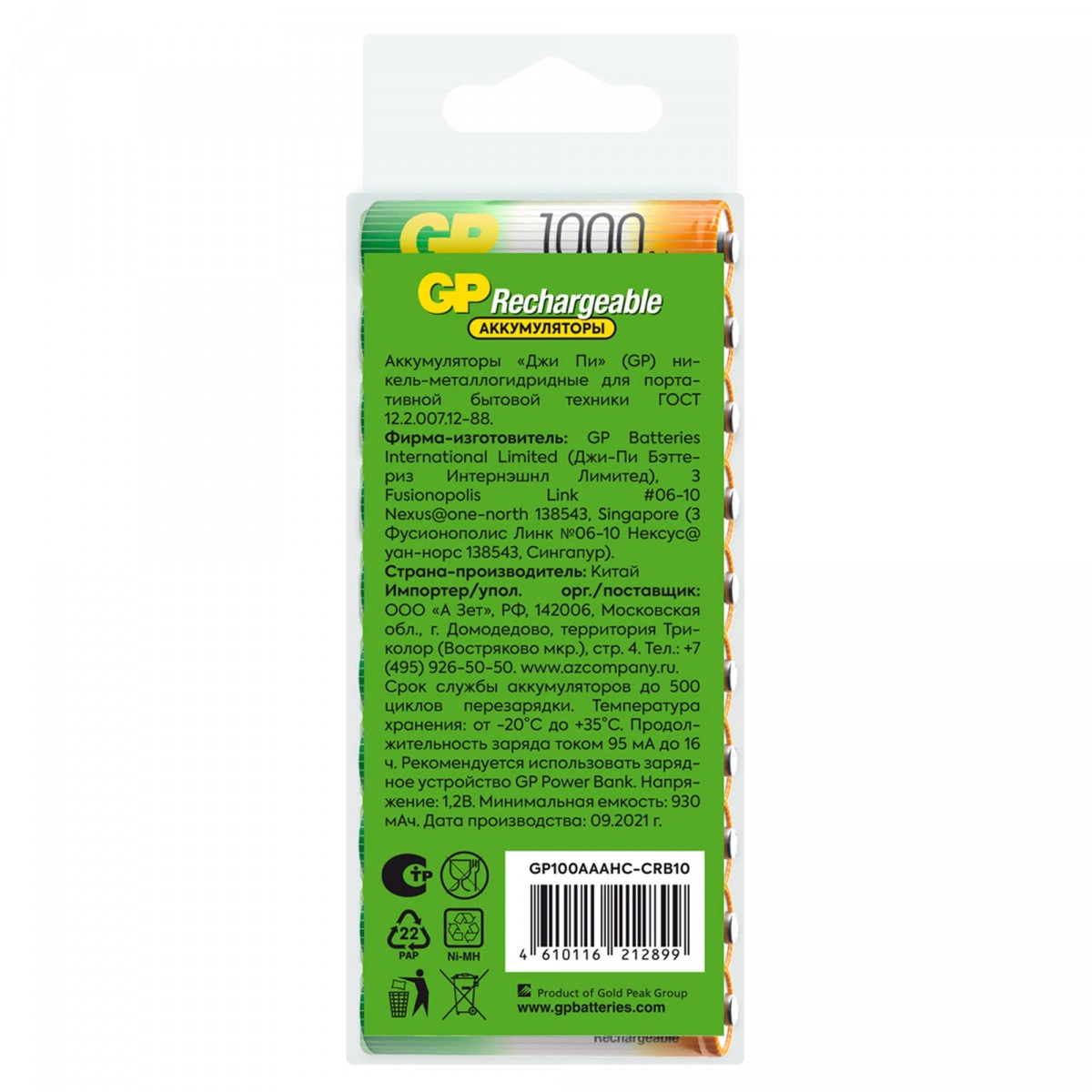 Аккумулятор перезаряжаемый GP 100AAAHC AAA емкости 930 10 шт. в пластиковом боксе