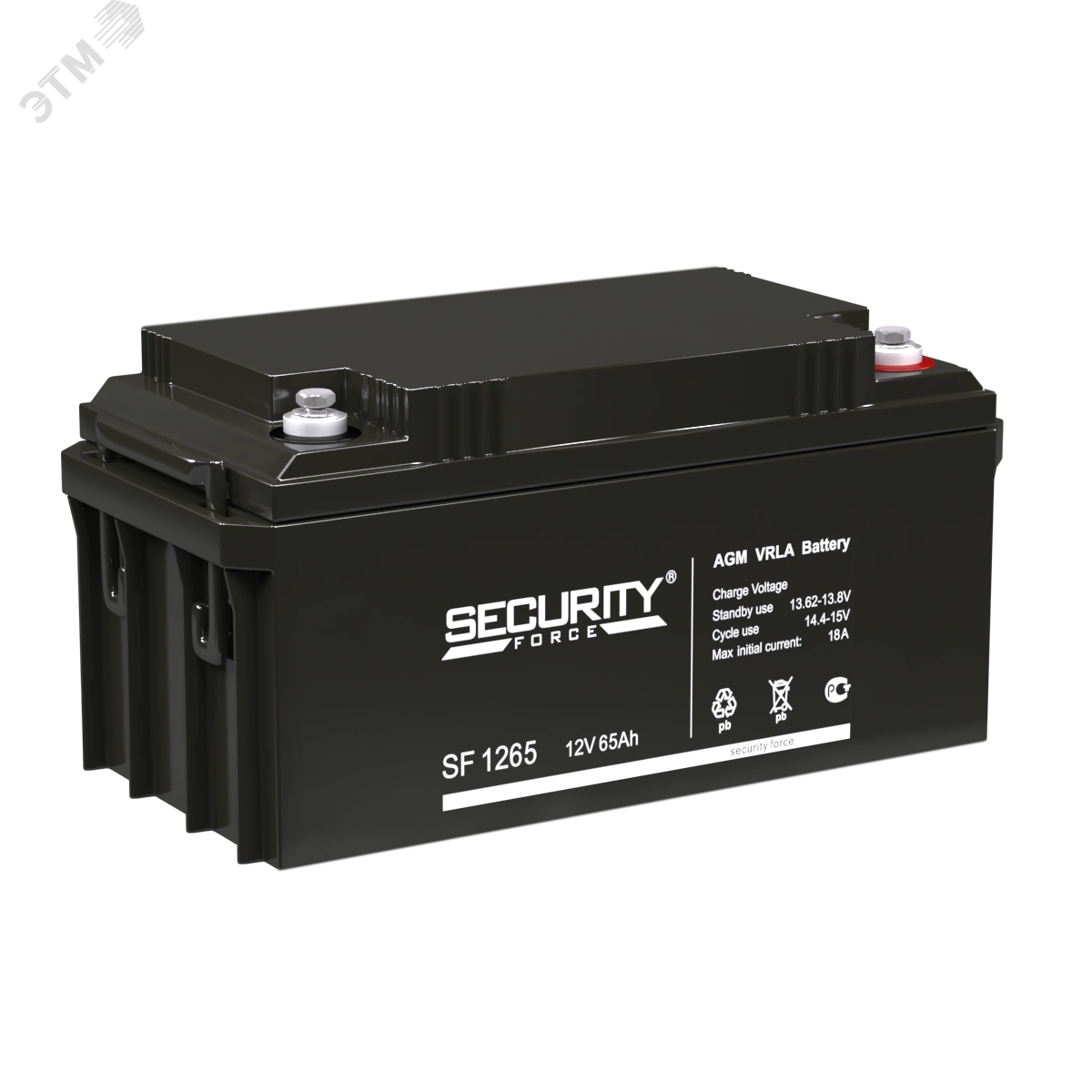 Аккумулятор Security Force SF 1265 благодаря своим характеристикам (напряжение 12 В, ёмкость 65 Ач) применяется в - охранных и пожарных системах, кассовых аппаратах, аварийном освещении. Корпус из ABS пластмассы надёжно запаян, это исключает протекание электролита и позволяет газам рекомбинировать. На крышке располагается односторонний клапан избыточного давления. Security Force SF 1265 работает как в циклическом, так и в буферном режиме. Благодаря стекловолоконным сепараторам (AGM) жидкий электролит удерживается в неподвижном состоянии. Срок службы аккумулятора 8 лет.