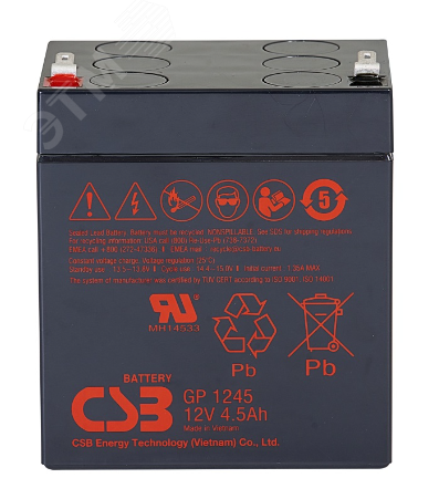CSB GP 1245 (12 В, 4.5 Ач) является одним из самых распространенных свинцово-кислотных аккумуляторов общего назначения. Корпус батареи выполнен из долговечного ABS-пластика и имеет предохранительный клапан для сброса избыточного давления. Аккумулятор полностью герметичен (не требует долива воды), а значит может работать в любом положении. CSB GP 1245 выполнен по технологии AGM (стекловолоконный сепаратор, пропитанный жидким электролитом). Срок службы достигает 5 лет или около 260 циклов при 100% разряде. Аккумуляторная батарея CSB GP 1245 имеет усовершенствованную конструкцию легированных кальцием электродов из особо чистого свинца, что обеспечивает продолжительный срок службы и улучшенные разрядные характеристики. Аккумулятор отвечает всем современным требованиям к герметизированным батареям, имеет сертификат соответствия Госстандарта РФ (''Ростест''), заключение ВНИИПО МВД ''О пожаровзрывобезопасности''.