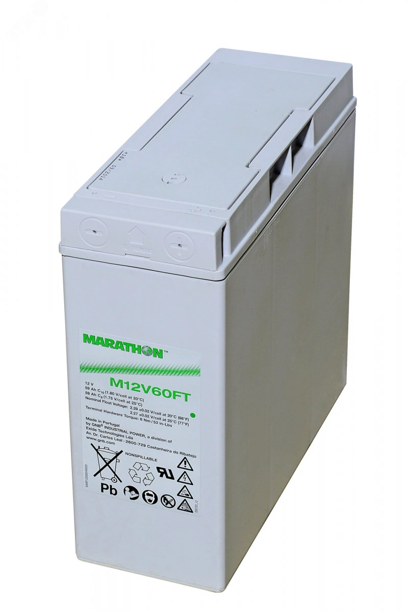 Аккумуляторы Marathon M12V60 FT HB ( 12V 59Ah / 12В 59Ач ) изготовлены по технологии AGM (жидкий электролит, впитанный в стекловолоконный сепаратор). Разработаны для размещения в специальных шкафах и стойках. Удобное обслуживание благодаря фронтальному расположению борнов.Срок службы - 12 лет при температуре окружающей среды 20 градусов по Цельсию (остаточная емкость 80%). Области применения - телекоммуникация и связь, источники бесперебойного питания (ИБП), производство и распределение электроэнергии, железная дорога.
