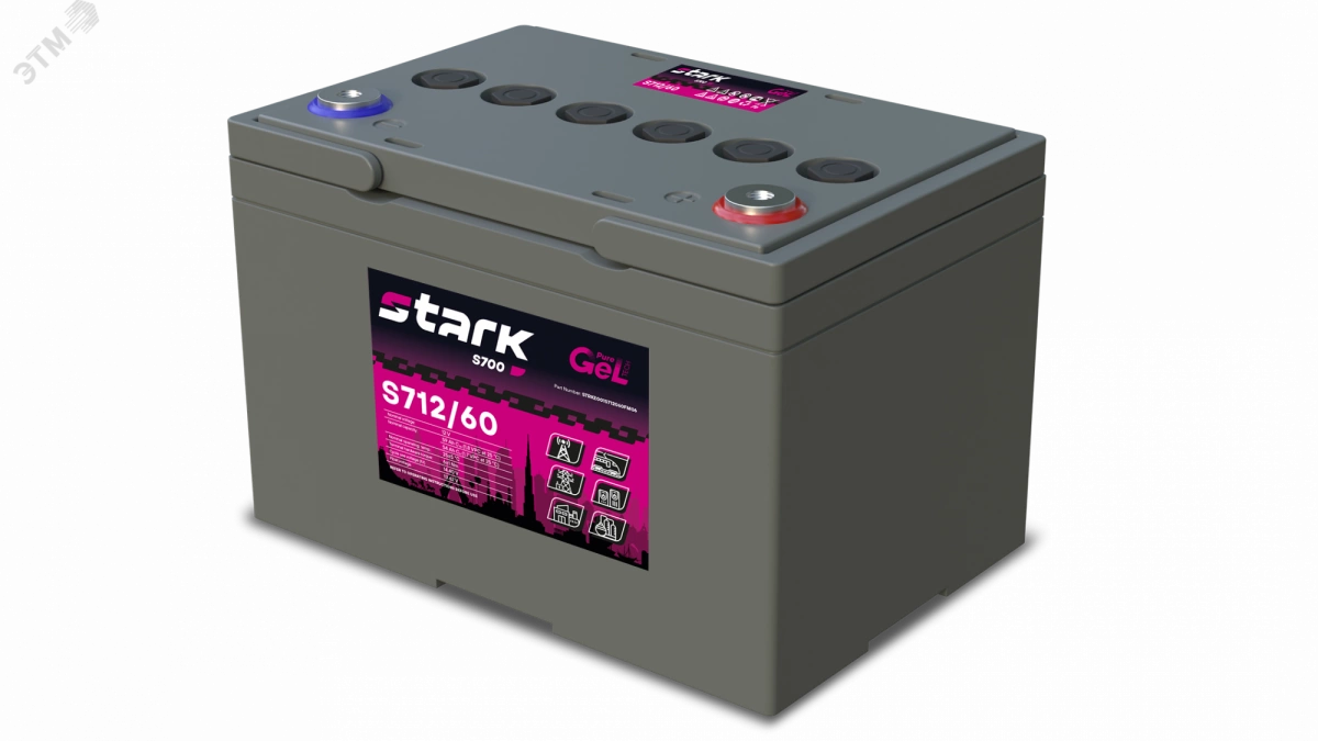 Свинцово-кислотный необслуживаемый гелевый аккумулятор Stark S712/60 напряжением 12 В ёмкостью 61 Ач изготовлен по технологии PURE GEL TECH. Раствор серной кислоты, смешанный с пирогенным диоксидом кремния, представляет из себя желеобразную массу — такое состояние электролита положительно сказывается на сроке эксплуатации: до 15 лет в буферном режиме и не менее 1200 циклов в циклическом. Герметичный корпус батареи выполнен из высокопрочного полимера, устойчивого к деформации. Аккумулятор можно эксплуатирова в вертикальном и горизонтальном положении. На крышке предусмотрены VRLA-клапаны, индивидуальный для каждой ячейки. Stark S712/60 надёжно герметизирован, обслуживать свинцово-кислотный аккумулятор не требуется.