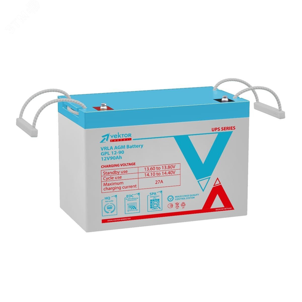 Герметизированный VRLA cвинцово-кислотный аккумулятор Vektor GPL 12-90 напряжением 12В и емкостью 90Ач изготовлен по технологии AGM (с микропористым заполнителем, пропитанным электролитом). Аккумуляторные батареи Vektor GPL обладают отличными разрядными и эксплуатационными характеристиками, обладают оптимальным сочетанием высококлассного и в то же время экономичного продукта для использования в различных типах оборудования. Специальный патентованный Pb-Ca-Sn-Al сплав. Характеризуется высокой плотностью энергии и повышенной защитой от коррозионной активности. Корпус аккумулятора выполнен из ABS-пластика, не поддерживающего горение. Срок службы аккумулятора рассчитан на 7-12 лет работы. Аккумулятор может использоваться как в буферном режиме, так и в режиме циклирования, обладает низким внутренним сопротивлением и саморазрядом. Низкий уровень саморазряда менее 3 процентов в месяц позволяет хранить аккумулятор без подзаряда более 6 месяцев при температуре не выше 20 градусов Цельсия.